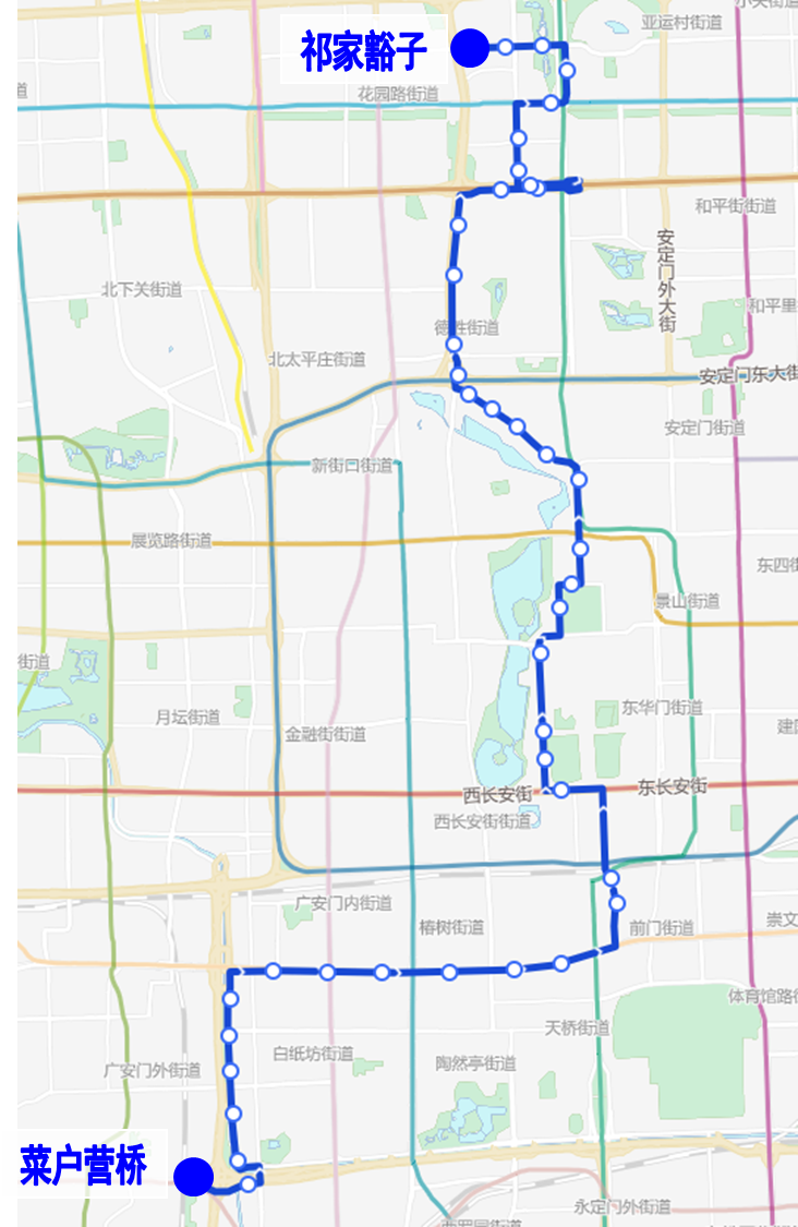 由菜户营桥发出,沿5路原路由至地铁北土城站,经北辰路、民族园路、民族园西路至祁家豁子。