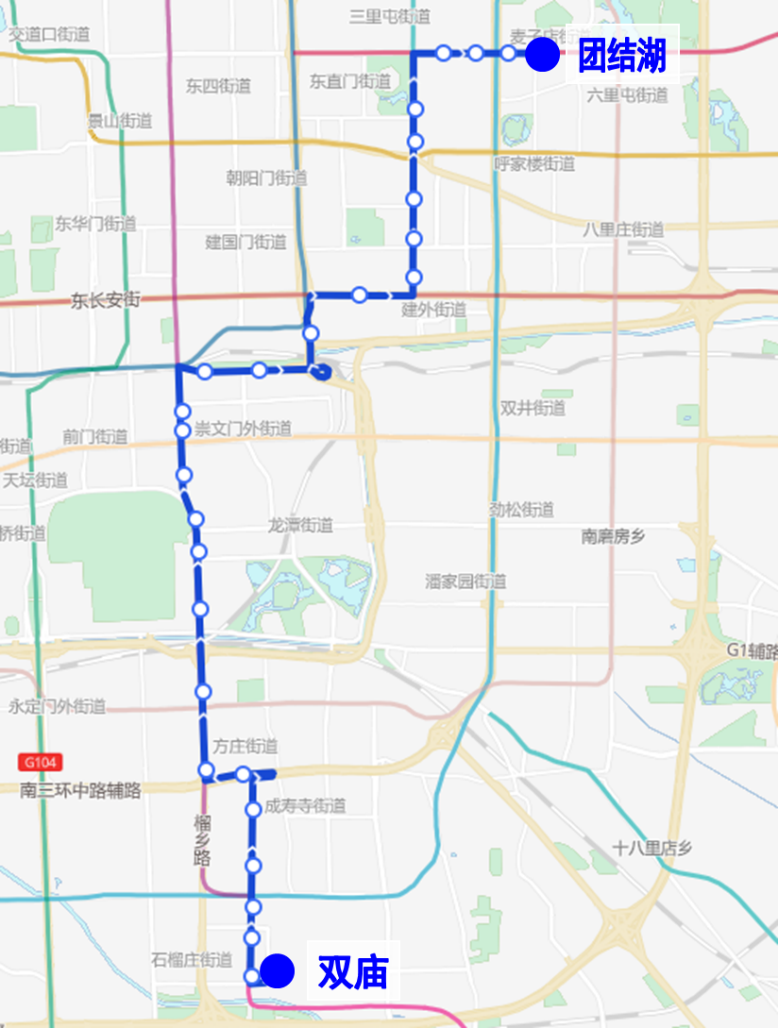 沿途设站:双庙、顶秀欣园、双庙北、地铁宋家庄站、宋家庄、顺四条、刘家窑桥东、刘家窑桥北、蒲黄榆、东侧路、天坛体育场、法华寺、红桥路口北、磁器口南(开往双庙方向)、磁器口北(开往团结湖方向)、花市路口南、崇文门东、东便门、建国门南、日坛路、永安里路口西(开往双庙方向)、永安里路口北(开往团结湖方向)、芳草地南、芳草地、东大桥路口北、朝阳医院、工人体育场(开往双庙方向)、三里屯、长虹桥西、长虹桥东(开往团结湖方向)、团结湖。