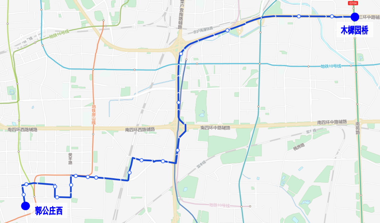 由郭公庄西发出,沿497路原路由至白盆窑,继续向东经六圈东路、银地西路至丰台南路,沿497路原路由至木樨园桥。