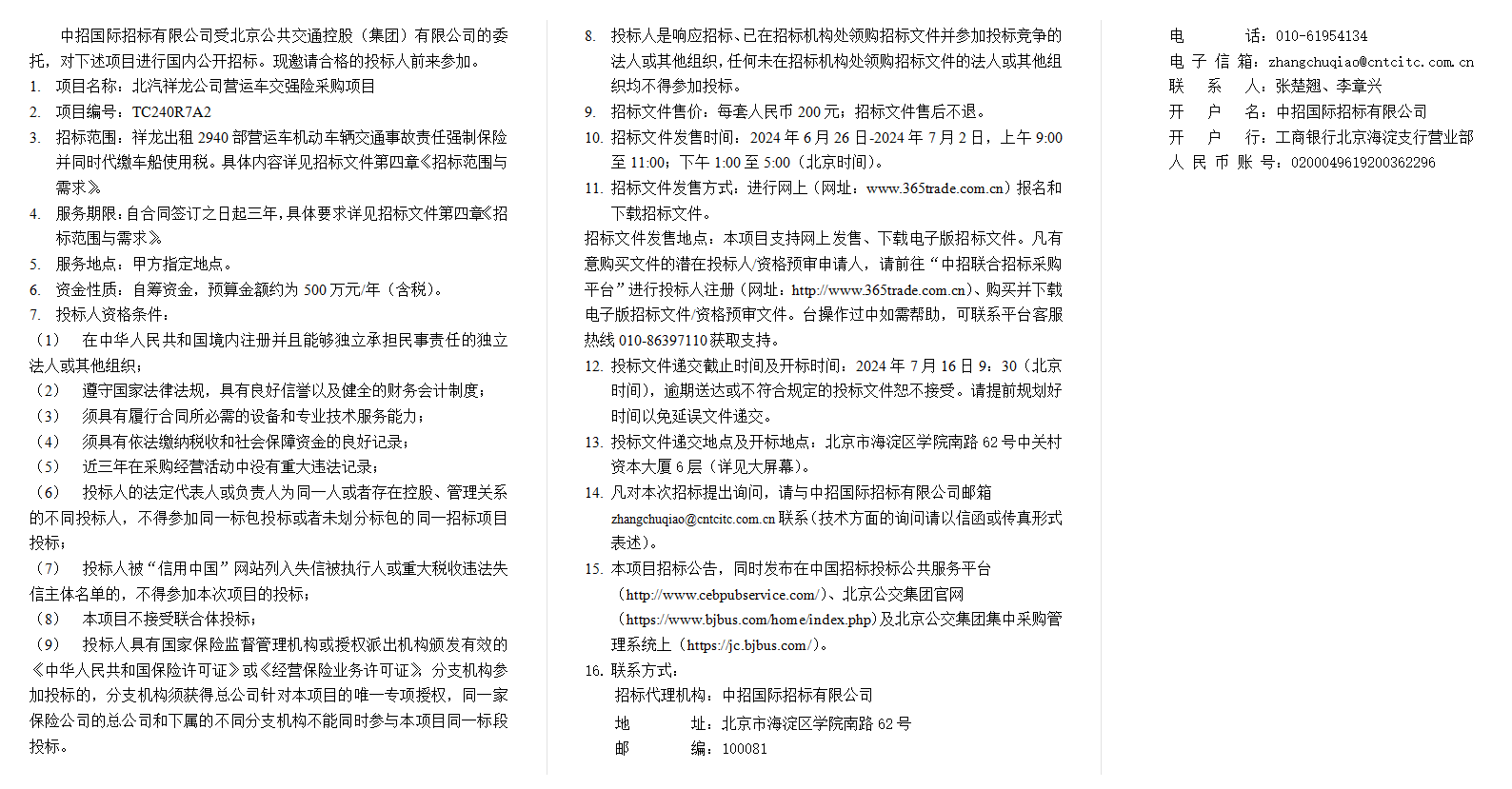 北汽出租集团15部12米级旅游车采购项目招标公告