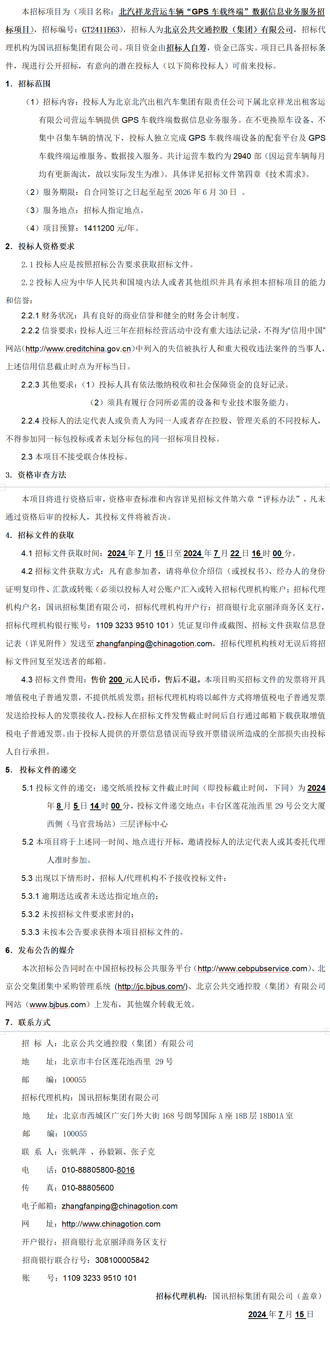 北汽祥龙营运车辆“GPS车载终端”数据信息业务服务招标项目公开招标公告