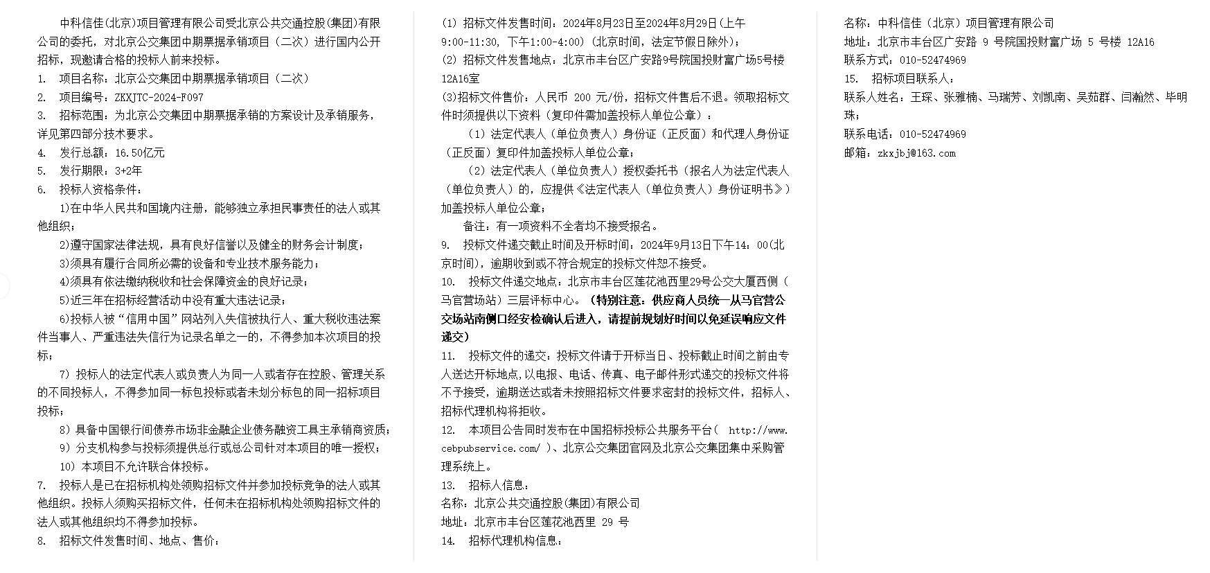 北京公交集团中期票据承销项目(二次)招标公告