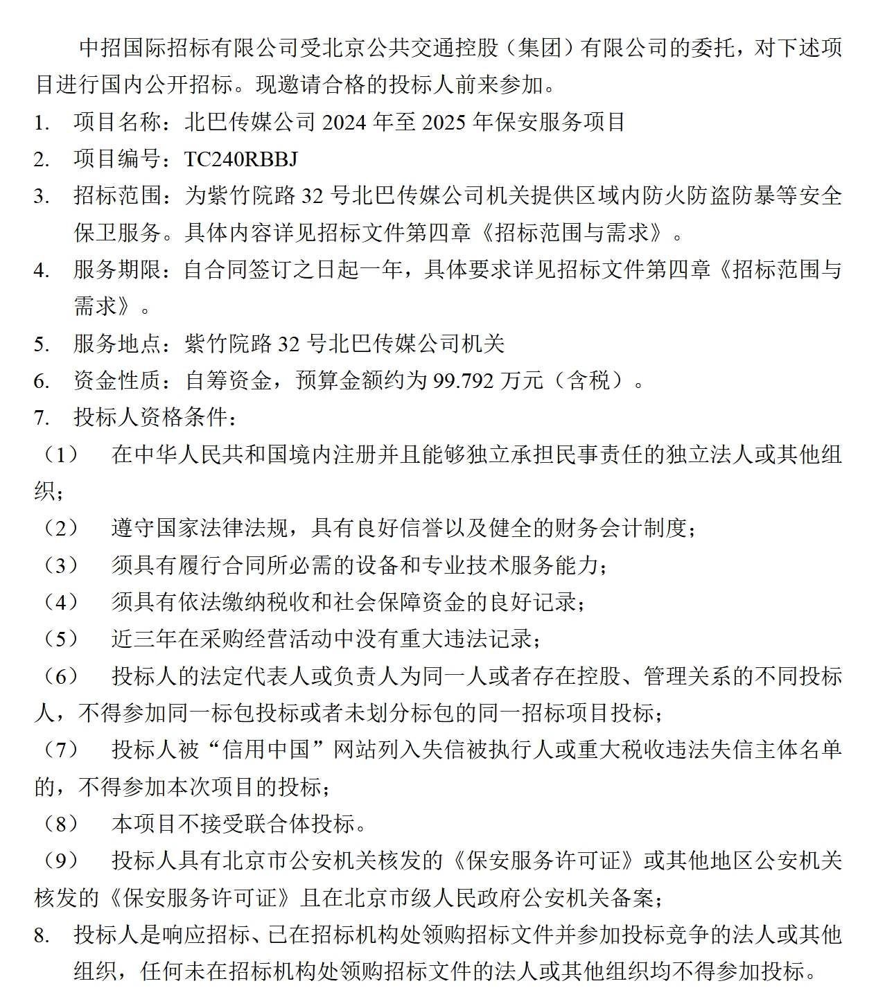 北巴传媒公司2024年至2025年保安服务项目招标公告