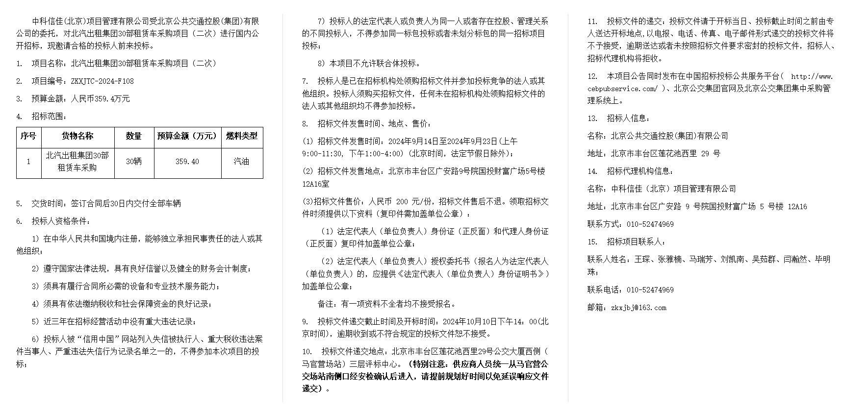 北汽出租集团30部租赁车采购项目(二次)招标公告