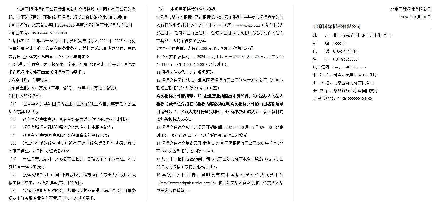 北京公交集团2024-2026年度财务决算审计服务采购项目招标公告