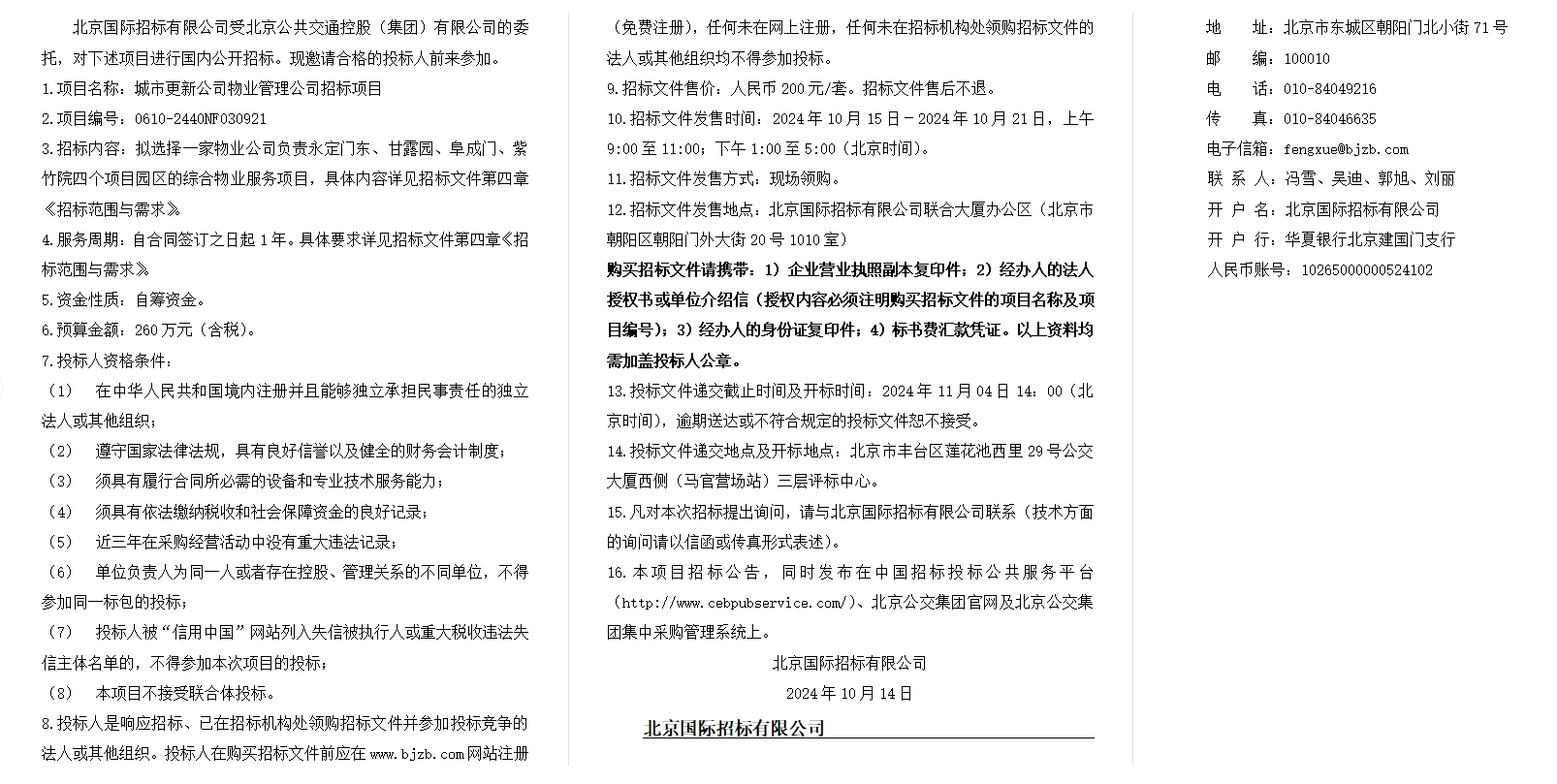 城市更新公司物业管理公司招标项目招标公告(二次)