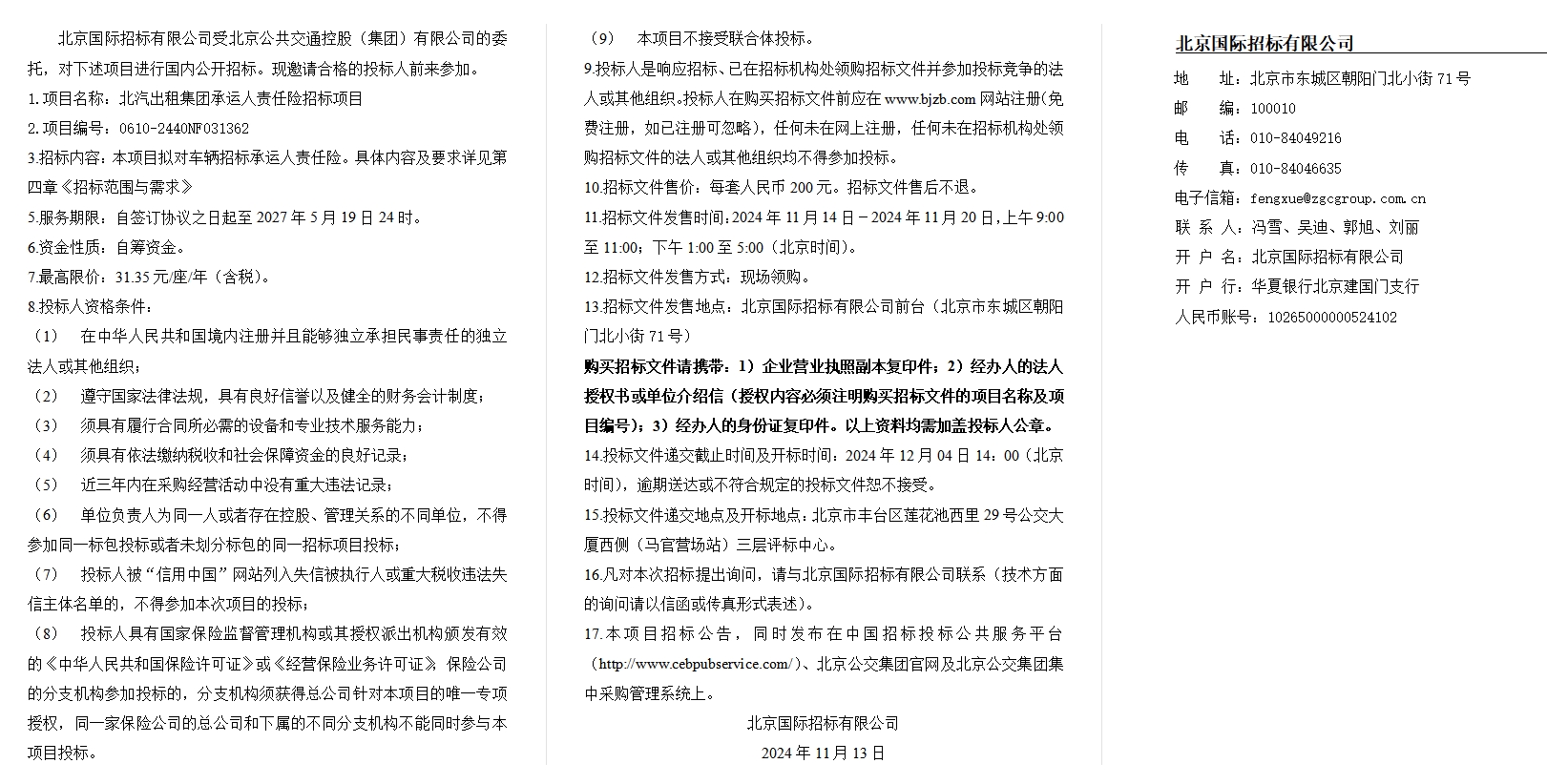 北汽出租集团承运人责任险招标项目招标公告