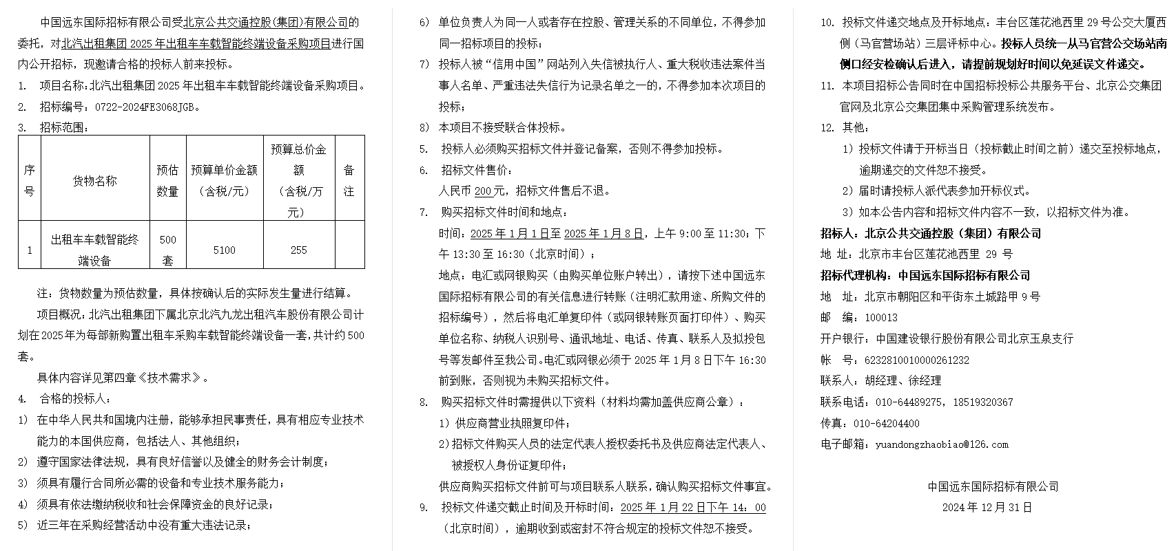 北汽出租集团2025年出租车车载智能终端设备采购项目招标公告