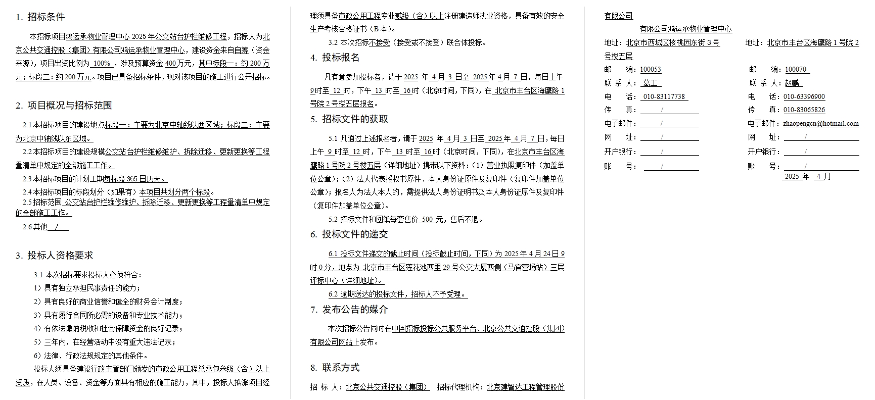 鸿运承物业管理中心2025年公交站台护栏维修工程招标公告
