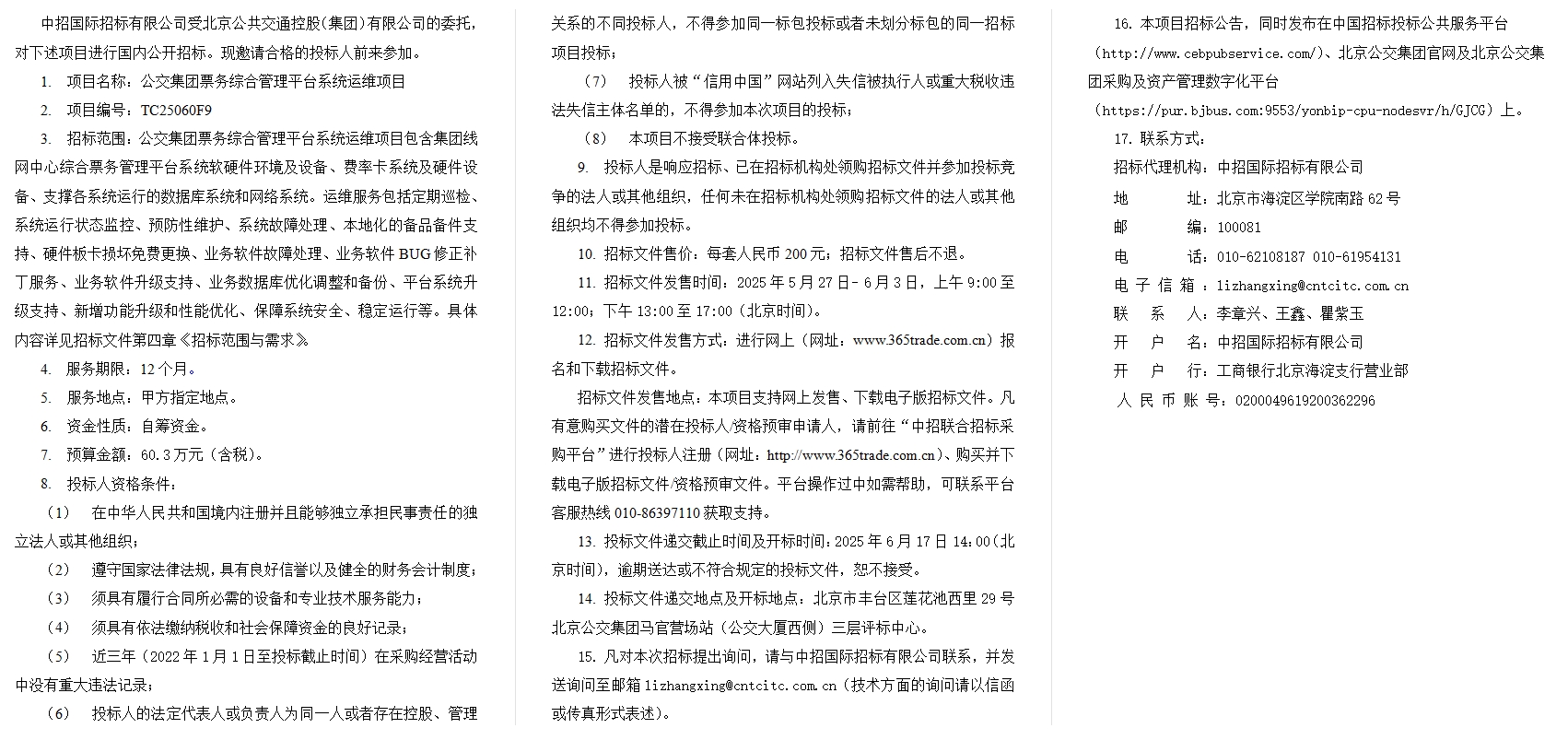 公交集团票务综合管理平台系统运维项目招标公告